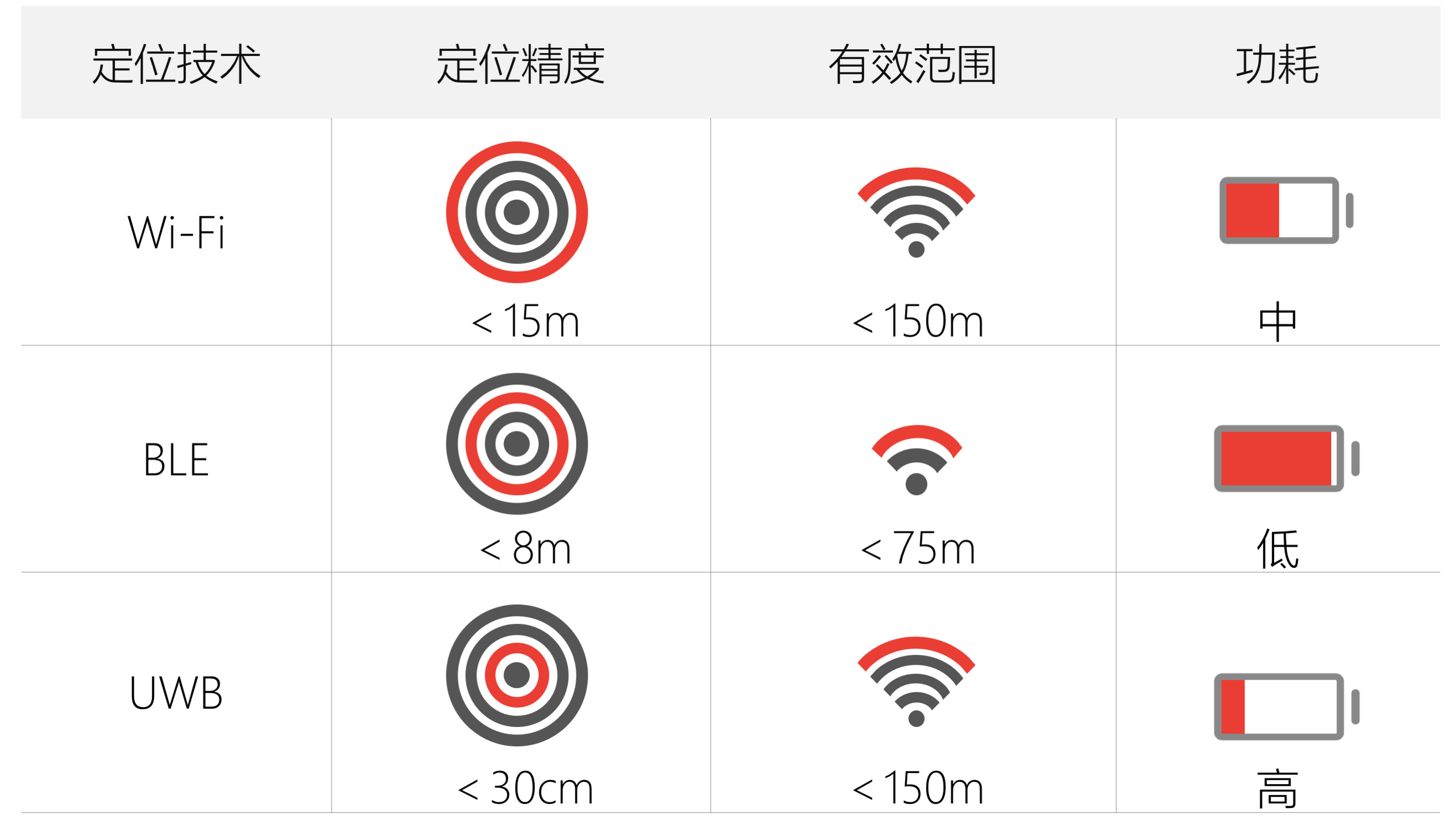 在定位精度方面UWB排名第一,可以達到30cm以內(nèi),其余技術(shù)的定位精度均在1m以上,遠遠低于UWB。同時在安全性,定位范圍等,UWB也是較高的。