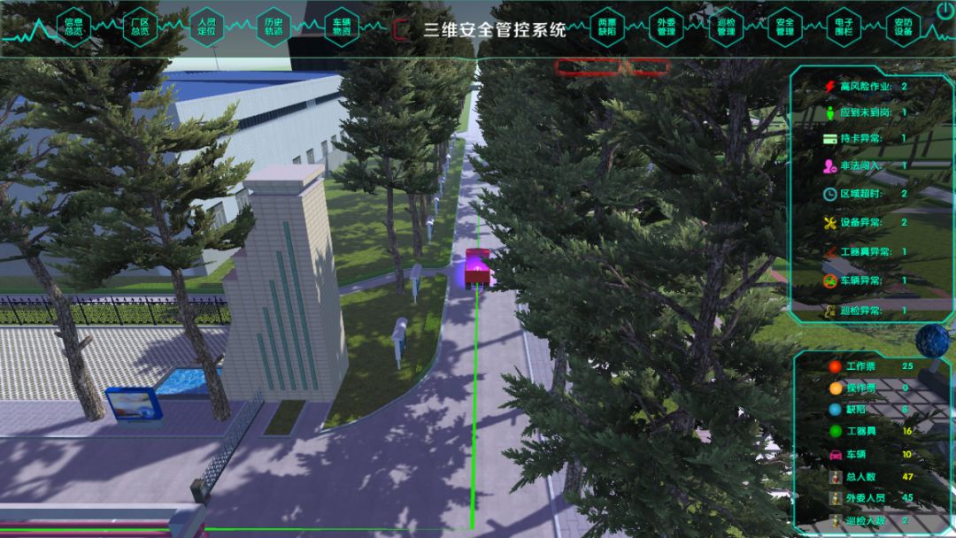 進出廠區的運送固廢車輛,危化品車輛、外來車輛、重型機械等安裝GPS定位。在系統中為車輛預設固定路線,并通過GPS進行追蹤,實現各類車輛的實時位置監督、跟蹤其行駛軌跡,一旦發現偏離預設路線立即報警并推送相關管理人員。