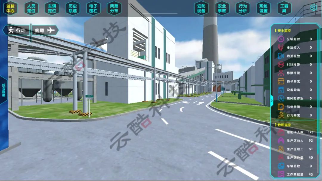 廠內(nèi)需要定位的車輛配備GPS/北斗雙模定位設(shè)備,系統(tǒng)后臺實時監(jiān)測車輛位置并在三維地圖上進行顯示,車輛定位可聯(lián)動視頻監(jiān)控和歷史軌跡播放。