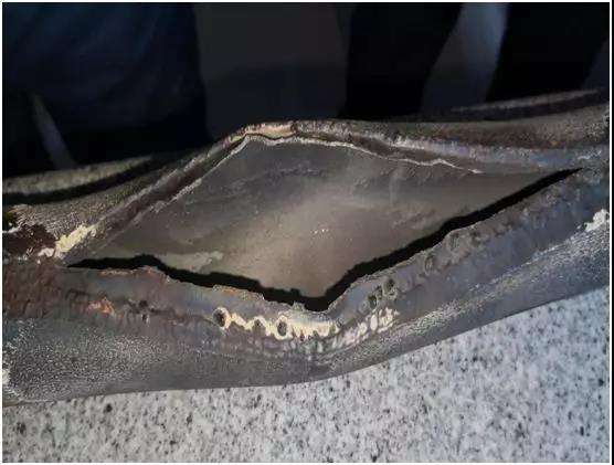 經(jīng)過檢查后發(fā)現(xiàn),造成本次事故的原因是過熱器爆管。流過熱器低溫段左側(cè)第二屏前向后數(shù)第三根管爆管,爆口距頂棚約4米,爆口外表面有長約200mm、寬約10mm溝痕,厚度1mm溝痕,斷口大部分壁厚小于1毫米。斷管后進行通球未發(fā)現(xiàn)異物,調(diào)取2018年10月9日1號機組啟動以來壁溫及煙溫曲線,未發(fā)現(xiàn)超溫情況,該管段附近無吹灰器(排除吹灰器吹損原因)。由于管子爆口下部管段存在明顯減薄缺陷,且原因不清,為進一步分析查明爆管及管子減薄缺陷的形成原因,2月18日,將爆管管樣寄至熱工院進行檢測分析。